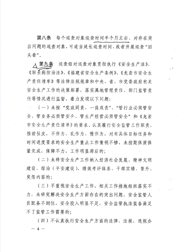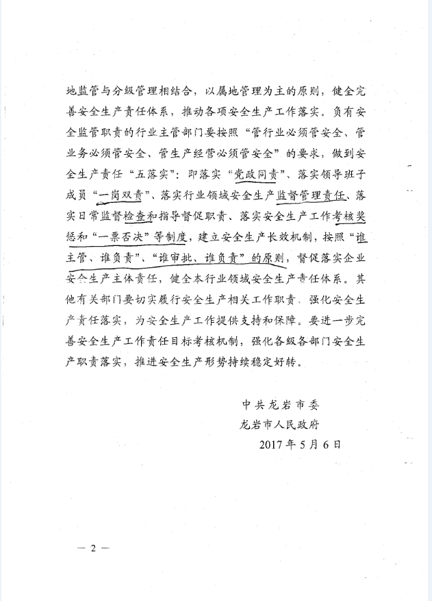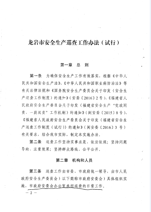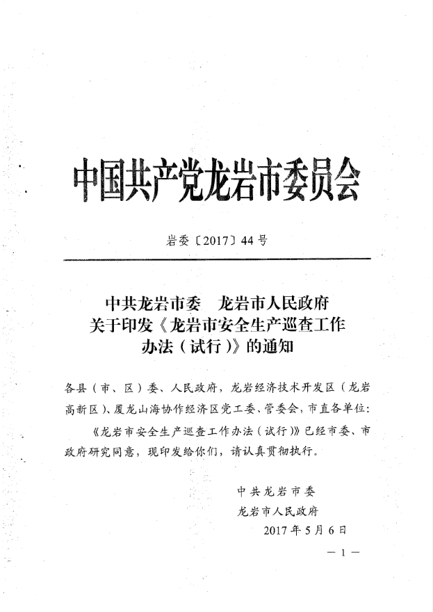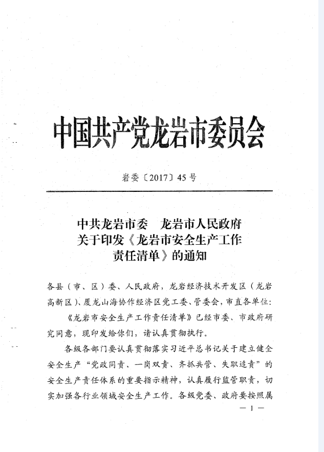 龍巖市安全生產責任清單及安全生產巡查工作辦法(巖委【2017】45)