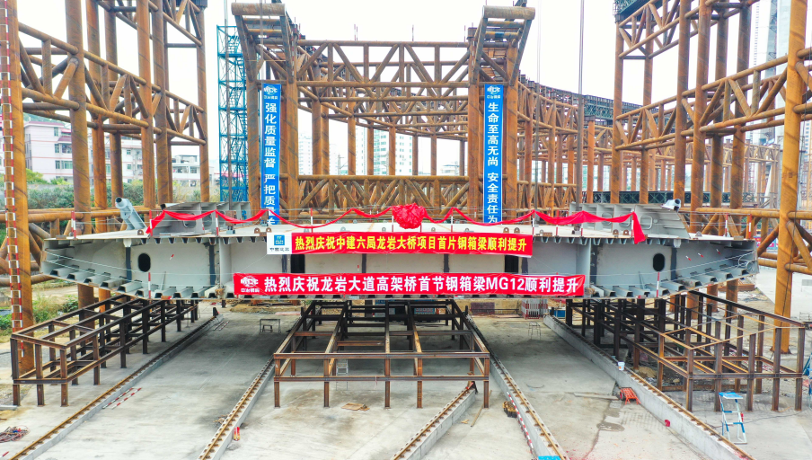 2019年12月31日上午9:28,龍巖大橋主橋首片鋼箱梁開始吊裝,標志著龍巖大橋主橋正式進入鋼箱梁施工階段。首片鋼箱梁提升、滑移、頂推共歷時約8小時完成,整個主橋結構共有26片鋼箱梁。